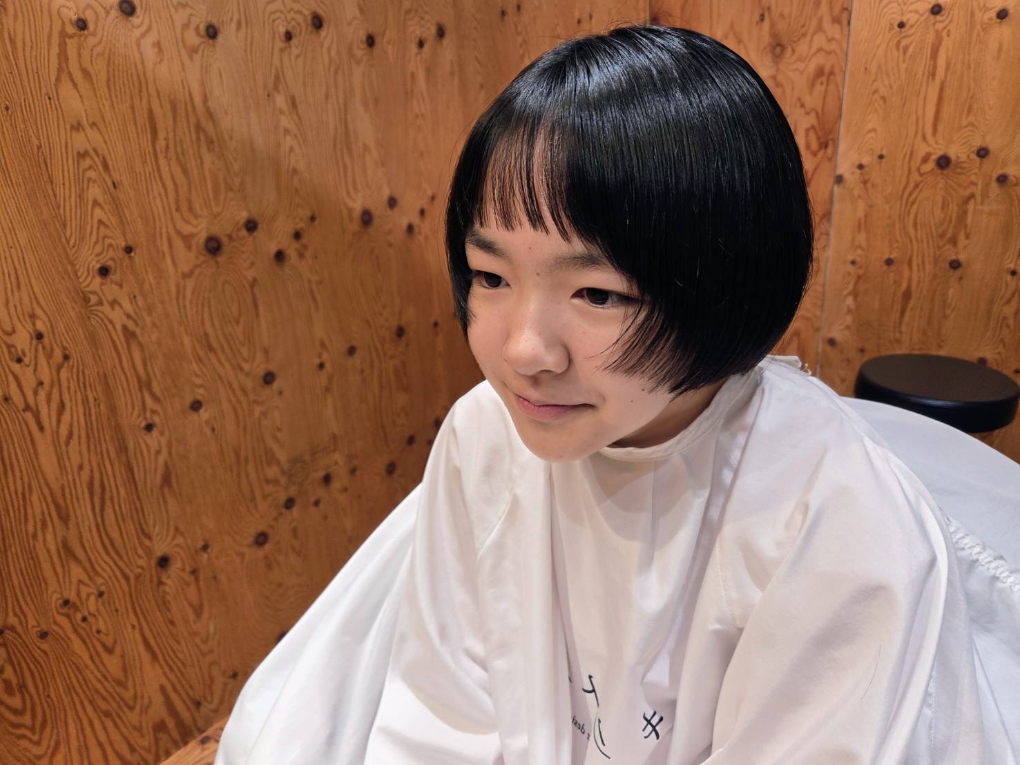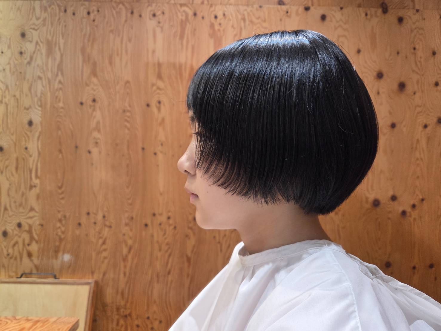 レイヤーなしの短いボブで丸みをつくり、可愛さが引き立つように。